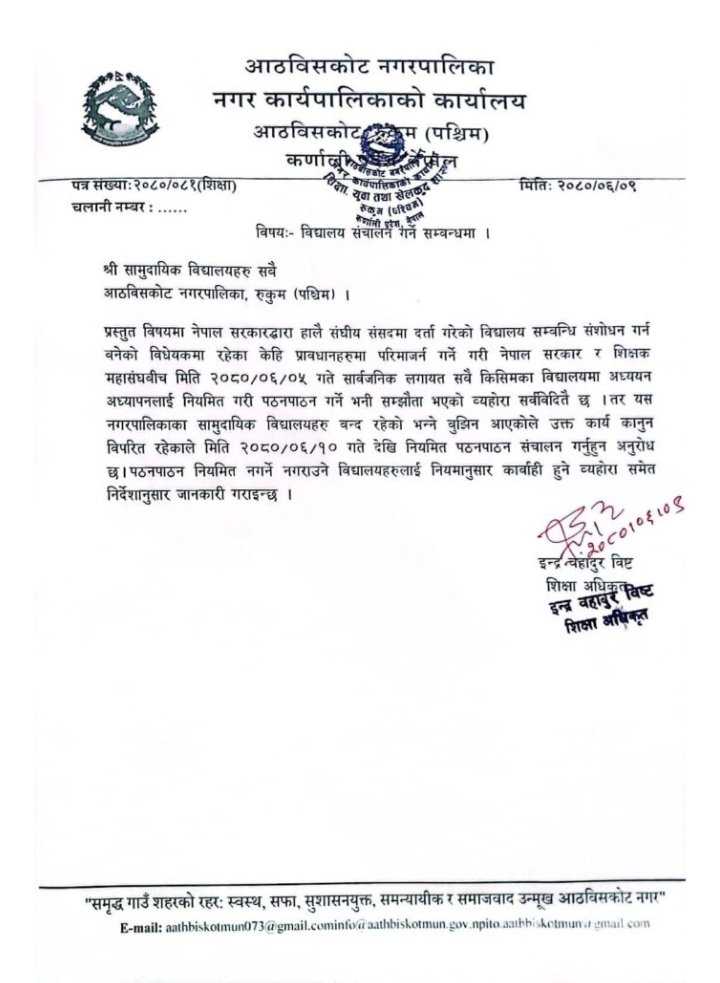 संघीय संसदमा विधालय सम्बन्धी संसोधन गर्न बनेको बिधेयकमा परिमार्जन गर्नेगरी असोज ५ गते सरकार र शिक्षक महासंघ बिच बिधालय सञ्चालन गर्ने भनी सहमती भएको थियो । तर हालसम्म आठबिसकोट नगरपालिका भित्रका बिधालयहरुमा पठनपाठन बन्द रहेकोले तत्कालै सञ्चालन गर्न निर्देशन दिईएको छ ।